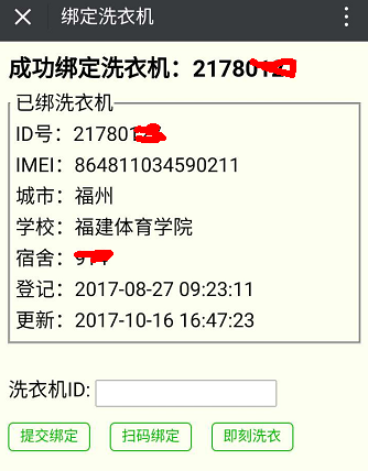3、如上图是成功绑定洗衣机后的界面,绑定成功后会显示洗衣机的具体信息,包括学校和宿舍等,