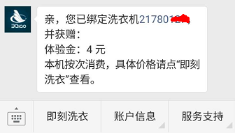 方法二:通过公众号的菜单页面输入洗衣机ID实现绑定。